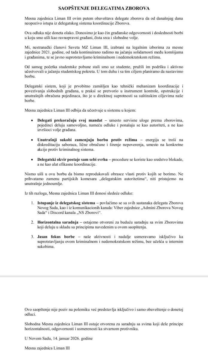 "Mesna zajednica Liman III ovim putem obaveštava delegate zborova da od današnjeg dana neopozivo istupa iz delegatskog sistema koordinacije Zborova. Ova odluka nije doneta olako. Donosimo je kao čin građanske odgovornosti i doslednosti borbi u koju smo ušli kao ravnopravni građani, čista srca i slobodne volje... Delegatski sistem, koji je prvobitno zamišljen kao tehnički mehanizam koordinacije i povezivanja slobodnih građana, u praksi se pretvorio u instrument kontrole, opstrukcije i unutrašnjih obračuna pojedinaca, što je u direktnoj suprotnosti sa suštinskim ciljevima naše borbe", navodi se u prvom delu saopštenja.