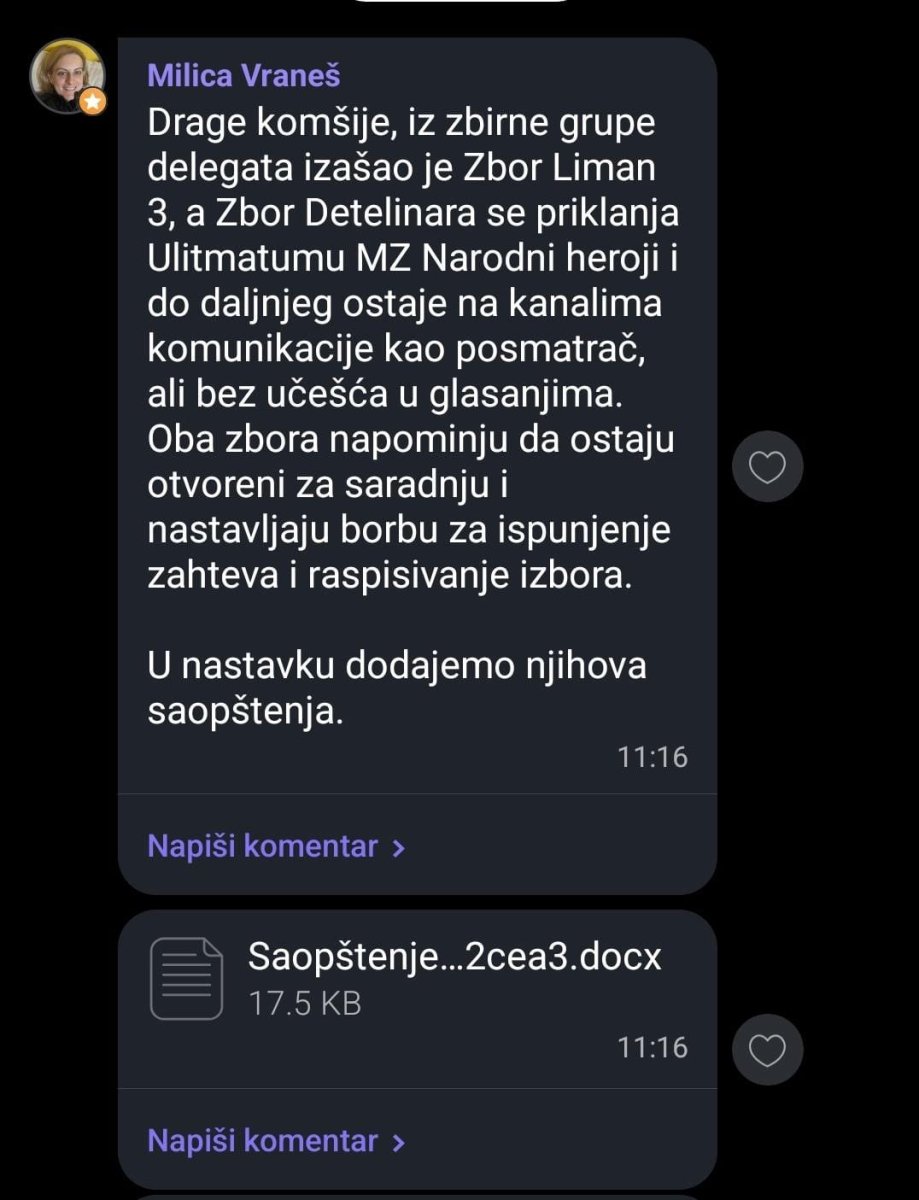Kako navode u poruci na Viberu iz zbirne grupe, Zbor Liman III je izašao, dok se Zbor Detelinar priklanja Ultimatum MZ Narodni heroj.
