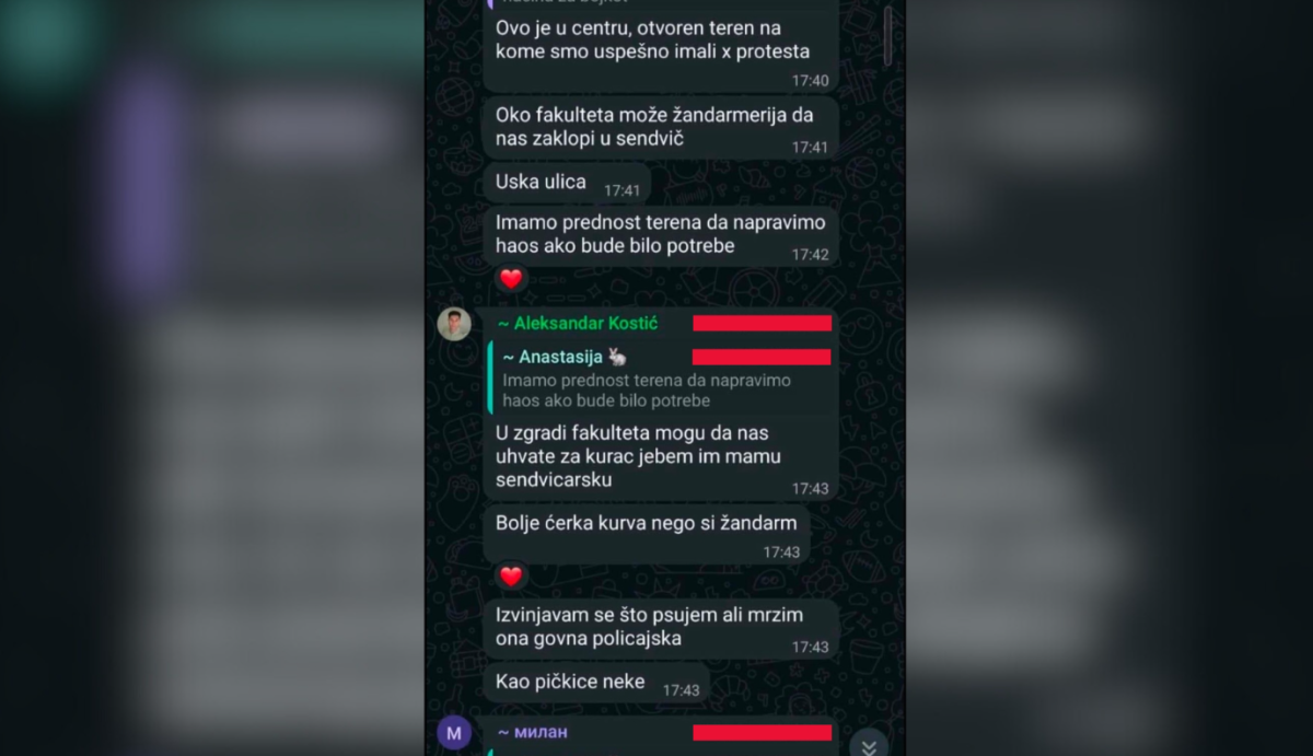 Ništa manje uznemirujuća nije ni njena komunikacija sa dotičnim Aleksandrom Kostićem, u kojoj se otvoreno iskazuje mržnja prema policiji i žandarmeriji, uz vulgarne i degradirajuće formulacije. Međutim, takav jezik nije slučajan. On razotkriva duboko antiinstitucionalni i anarhistički karakter grupe blokadera ekstremista koja sebe lažno predstavlja kao glas svih studenata Filozofskog fakulteta u Nišu.