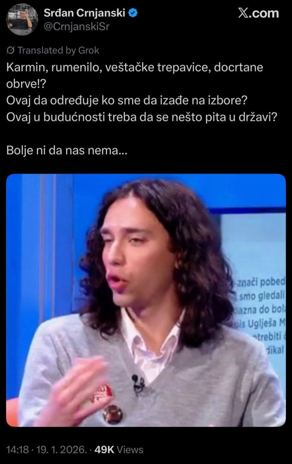 - Karmin, rumenilo, veštačke trepavice, docrtane obrve?! Ovaj da određuje ko sme da izađena izbore? Ovaj u budućnosti treba da se nešto pita u državi? Bolje ni da nas nema... - napisao je na Iksu blokader koji se predstavlja kao Srđan Crnjanski.
