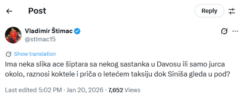 - Ima neka slika Ace šiptara sa nekog sastanka u Davosu ili samo jurca okolo, raznosi koktele i priča o letećem taksiju dok Siniša gleda u pod? - glasi sraman komentar koji je Štimac objavio na Iksu.