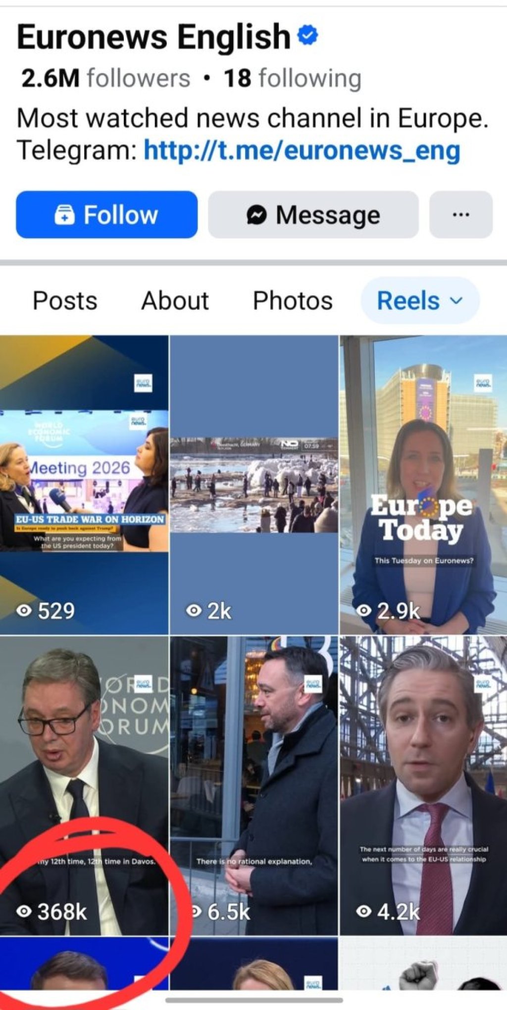 Govor predsednika Srbije Aleksandra Vučića iz Davosa ubedljivo je najgledaniji na zvaničnom Fejsbuk profilu Juronjuz Ingliš (Euronews English).
