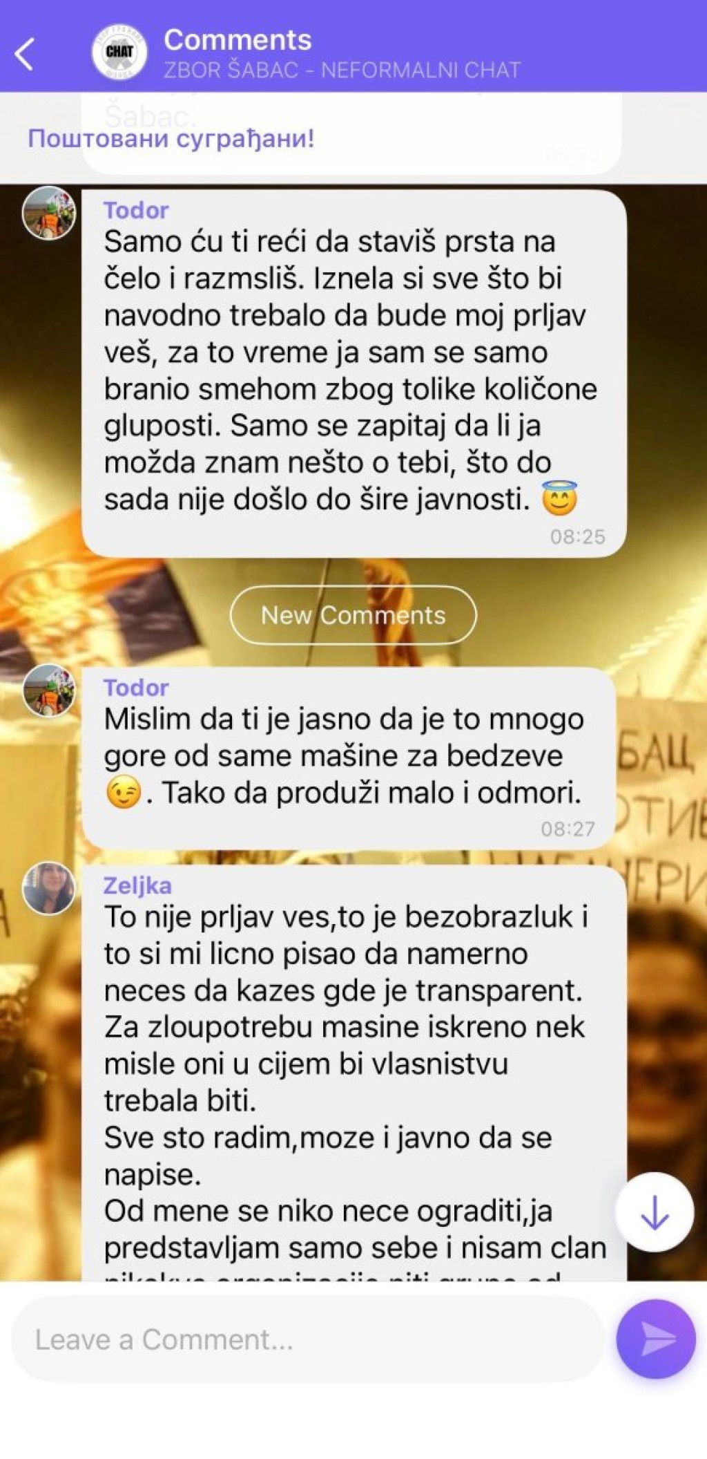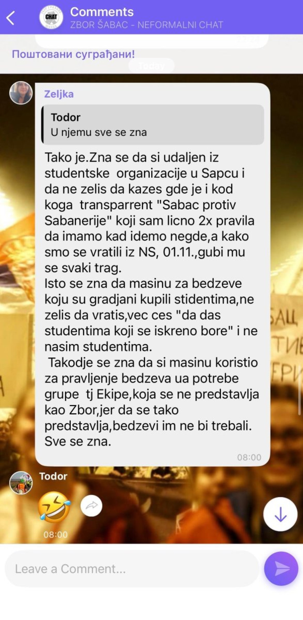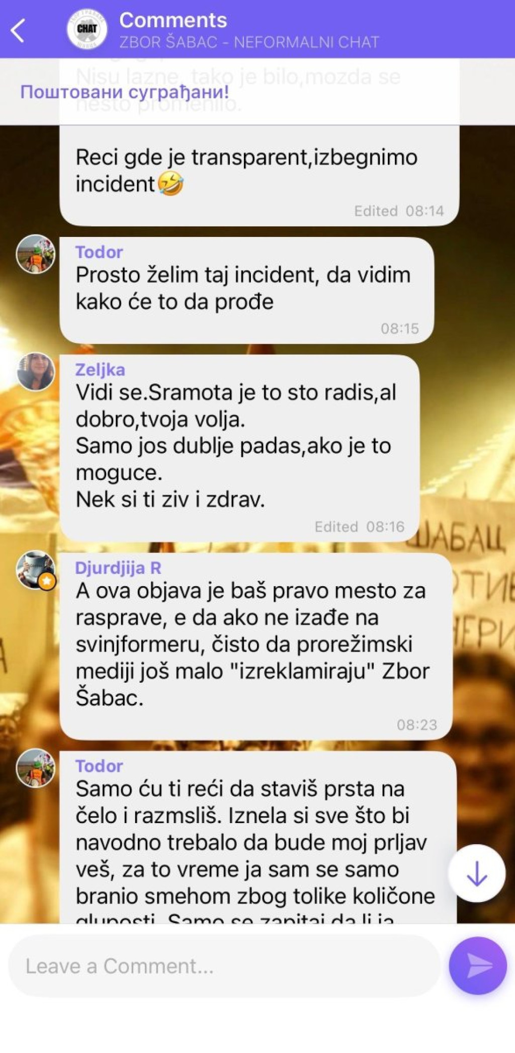 Blokaderi u Šapcu su međusobno "skočili jedni na druge", figurativno rečeno, kada su počeli da traže krticu u Viber grupi, pa su ostale članove počastili prepiskom koja podseća na pijačno prepucavanje, zbog čega su ostali članovi razočarano reagovali.