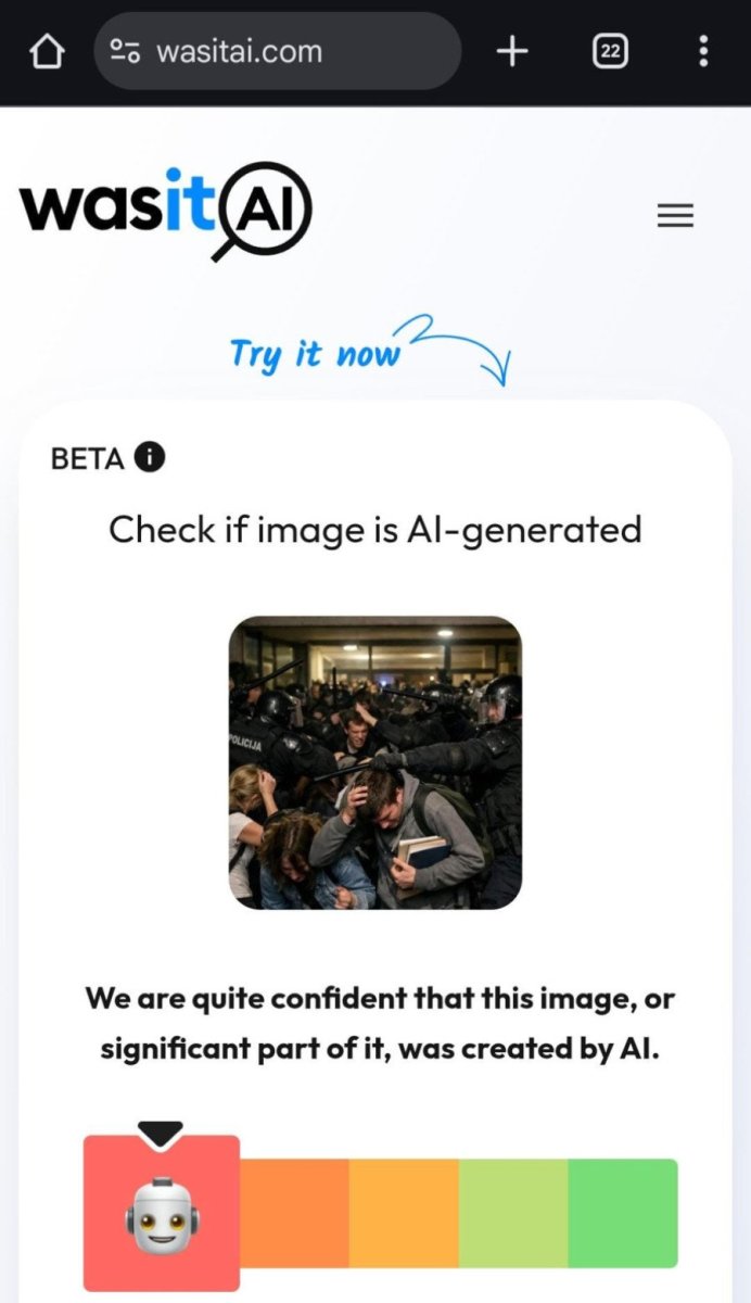 Ovi alati, dostupni javnosti na internetu, koriste se upravo za otkrivanje manipulacija i digitalnih falsifikata, a u ovom slučaju dva nezavisna sistema ukazuju da je slika delo veštačke inteligencije.