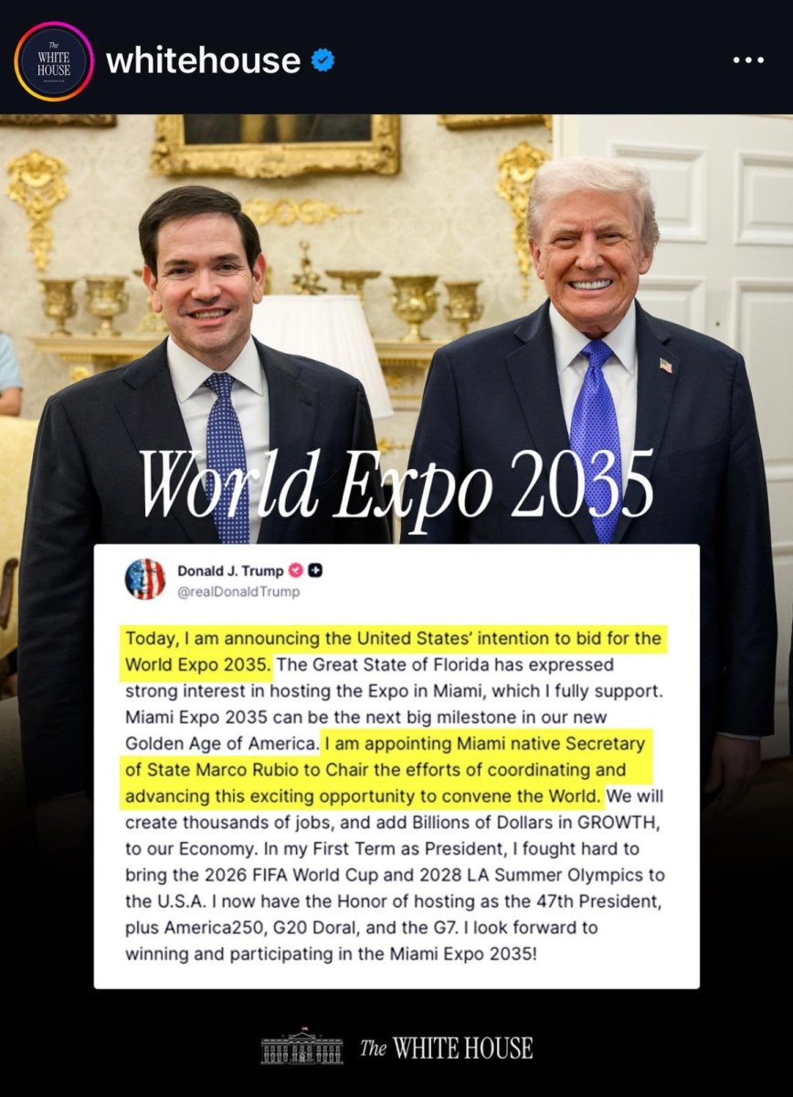 - Danas objavljujem nameru Sjedinjenih Američkih Država da se kandiduju za Svetsku izložbu EKSPO 2035. Velika država Florida izrazila je snažno interesovanje da bude domaćin EKSPO-a u Majamiju, što u potpunosti podržavam. EKSPO Majami 2035 može biti sledeća velika prekretnica u našem novom zlatnom dobu Amerike. Imenujem državnog sekretara, rođenog Majamca, Marka Rubija da predsedava naporima koordinacije i unapređenja ove uzbudljive prilike da okupimo svet. Otvorićemo hiljade radnih mesta i dodati milijarde dolara RASTA našoj ekonomiji. U mom prvom mandatu kao predsednika, žestoko sam se borio da dovedem Svetsko prvenstvo u fudbalu 2026. i Letnje olimpijske igre 2028. u Los Anđelesu u Sjedinjene Američke Države. Sada imam čast da kao 47. predsednik budem domaćin, uz Amerika 250, G20 Doral i G7. Radujem se pobedi i učešću na EKSPO Majami 2035 - napisao je Tramp na društvenoj mreži "Truth Social".