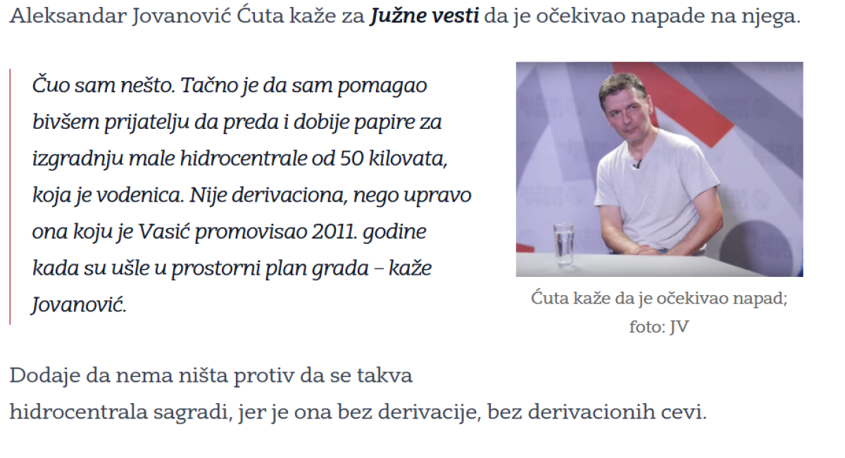 - Čuo sam nešto. Tačno je da sam pomagao bivšem prijatelju da preda i dobije papire za izgradnju male hidrocentrale od 50 kilovata, koja je vodenica. Nije derivaciona, nego upravo ona koju je Vasić promovisao 2011. godine kada su ušle u prostorni plan grada - govorio je tada Jovanović i dodao da nema ništa protiv da se takva hidrocentrala sagradi, jer je ona bez derivacije, bez derivacionih cevi.