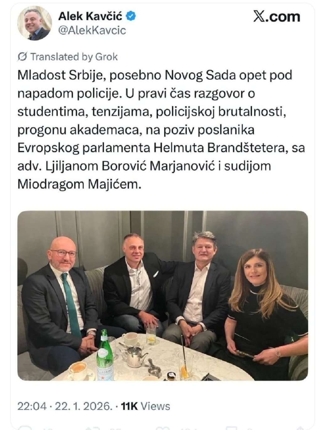 - Mladost Srbije, posebno Novog Sada, opet pod napadom policije. U pravi čas razgovor o studentima, tenzijama, policijskoj brutalnosti, progonu akademaca, na poziv poslanika Evropskog parlamenta Helkmuta Brandštetera - napisao je Kavčić na Iksu.