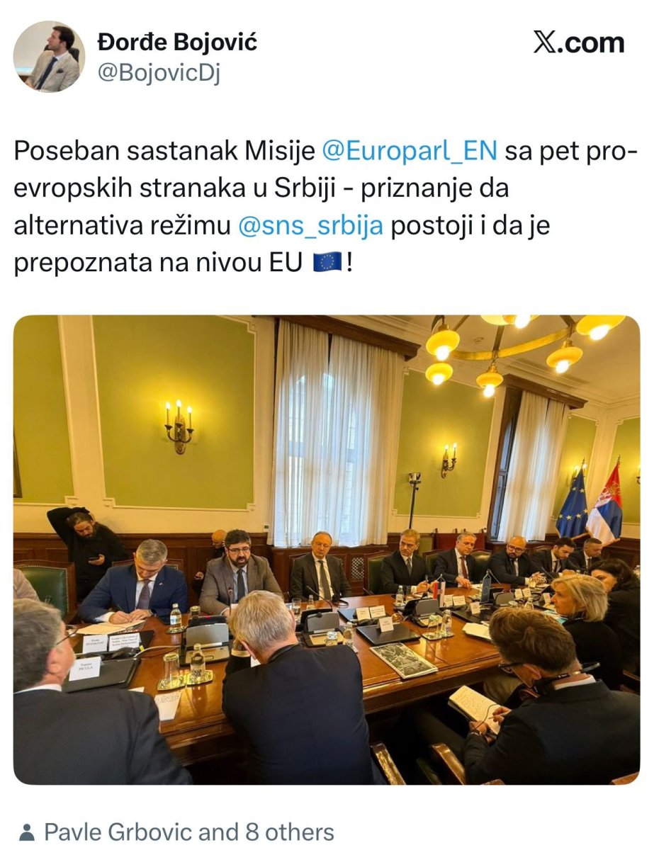 Na društvenim mrežama objavljena je fotografija sa posebnog sastanka Misije Evropskog parlamenta sa pet takozvanih proevropskih stranaka u Srbiji. Uz fotografiju, jedan od učesnika sastanka otvoreno poručuje da je reč o „priznanju da alternativa režimu postoji i da je prepoznata na nivou EU“. Drugim rečima – ono što su predsednik Vučić i Ana Brnabić govorili mesecima, sada potvrđuju sami akteri blokaderske scene.