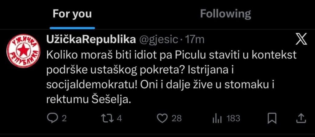 - Koliko morašp biti idiot pa Piculu staviti u kontekst podrške ustaškog pokreta? Istrijana i socijaldemokratu. Oni i dalje žive u stomaku i rektumu Šešelja - napisao je sraman komentar na Iksu antrisrbin Ješić.