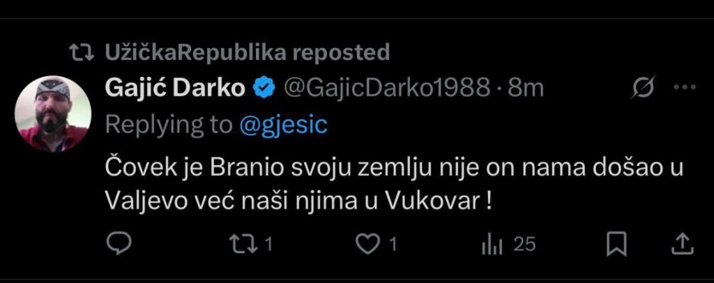 - Čovek je branio svoju zemlju. Nije on nama došao u Veljevo, već naši njemu u Vukovar - napisao je na Iksu blokader Gajić Darko, što se Ješiću očigledno mnogo dopalo, pa je i taj komentar objavio na svom Iks nalogu.