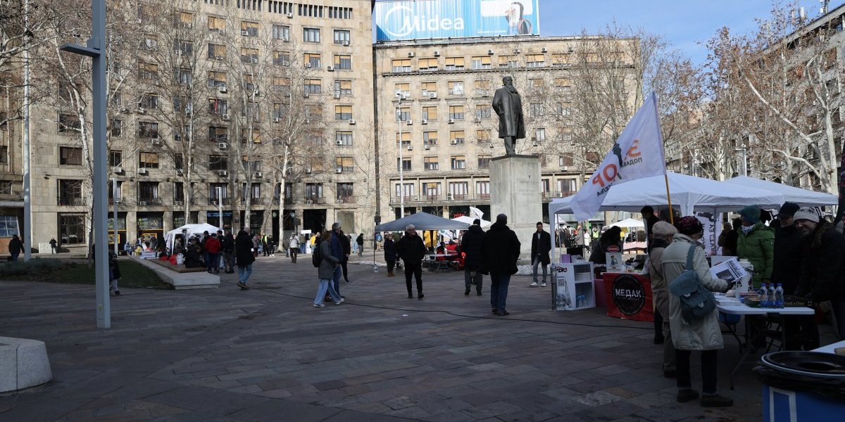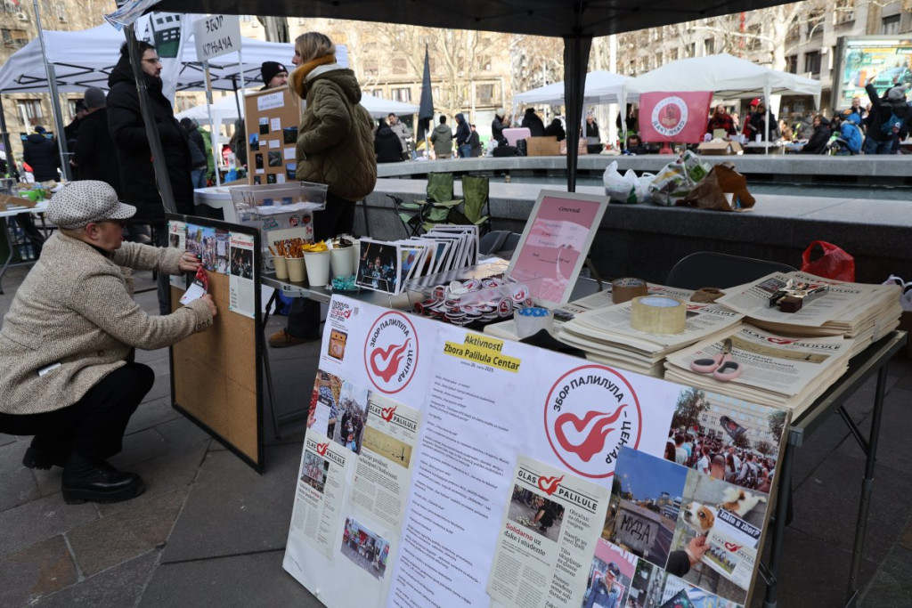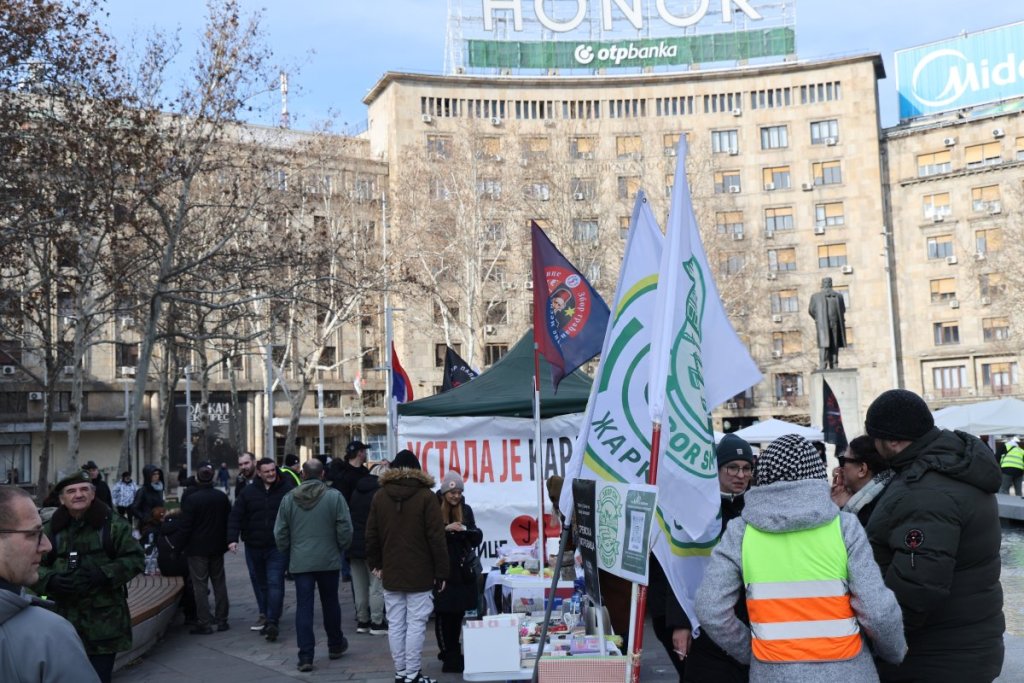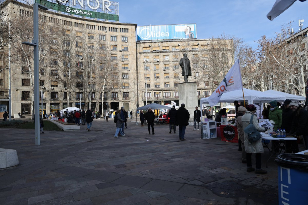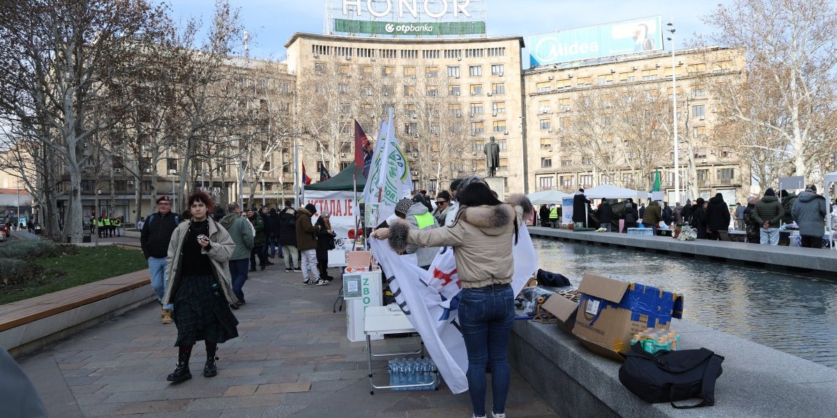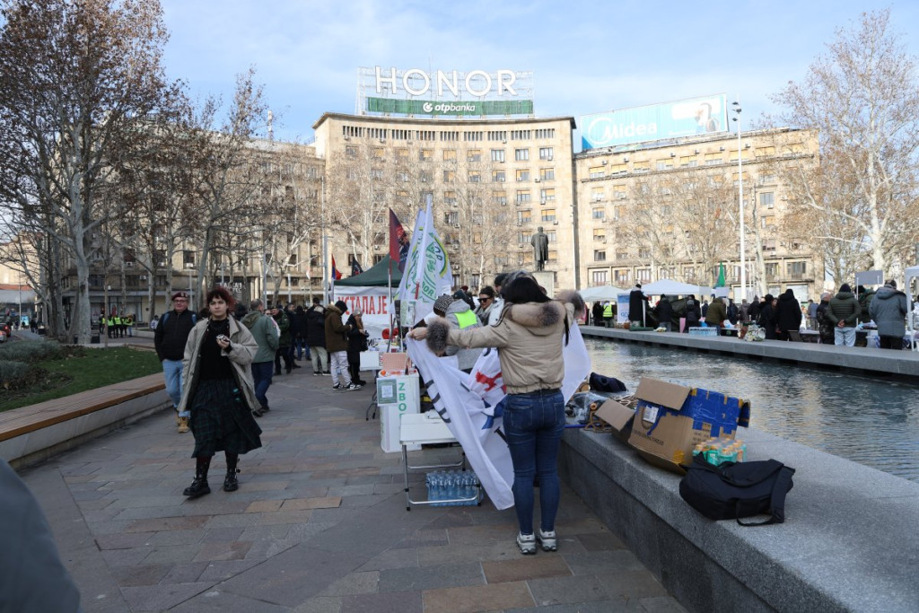 Kao što možete videti na snimku u nastavku, šatori su raspoređeni u centralnom delu Trga Nikole Pašića, a prisutne su manje grupe blokaderskih učesnika.