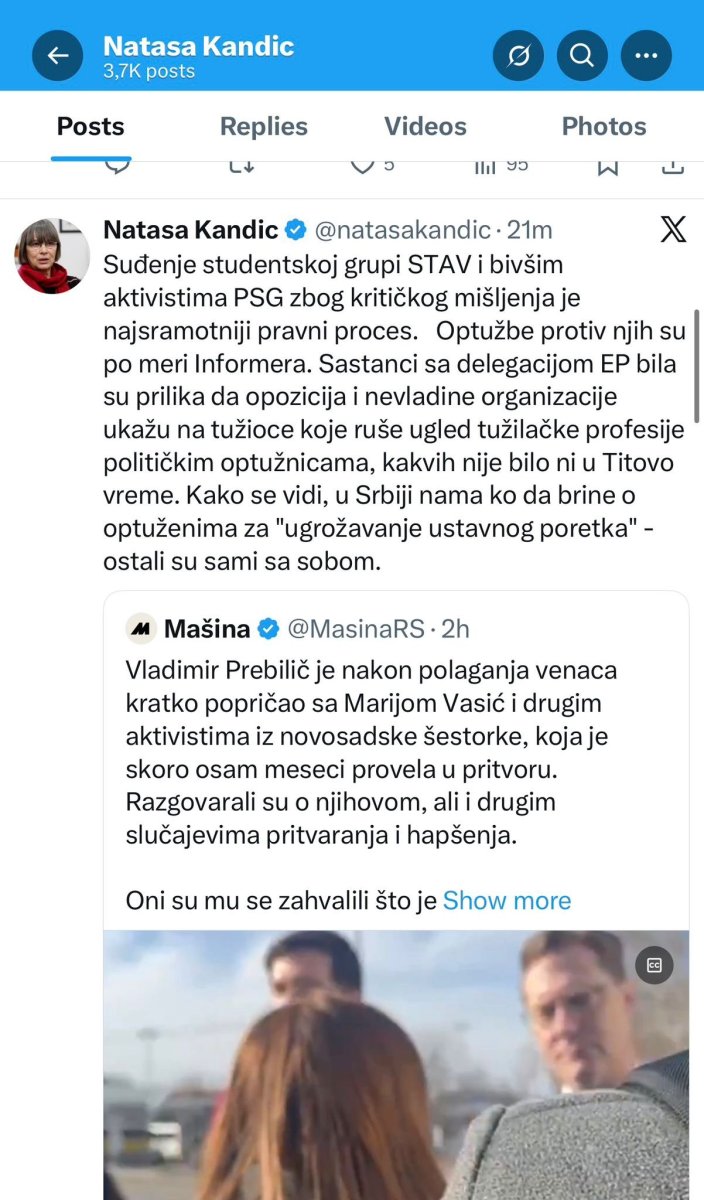 - Suđenje studentskoj grupi STAV i bivšim aktivistima PSG zbog kritičkog mišljenja je najsramotniji pravni proces. Optužbe protiv njih su po meri Informera. Sastanci sa delegacijom EP bila su prilika da opozicija i nevladine organizacije ukažu na tužioce koje ruše ugled tužilačke profesije političkim optužnicama, kakvih nije bilo ni u Titovo vreme. Kako se vidi, u Srbiji nama ko da brine o optuženima za "ugrožavanje ustavnog poretka" - ostali su sami sa sobom - navela je Kandić na "Iksu".