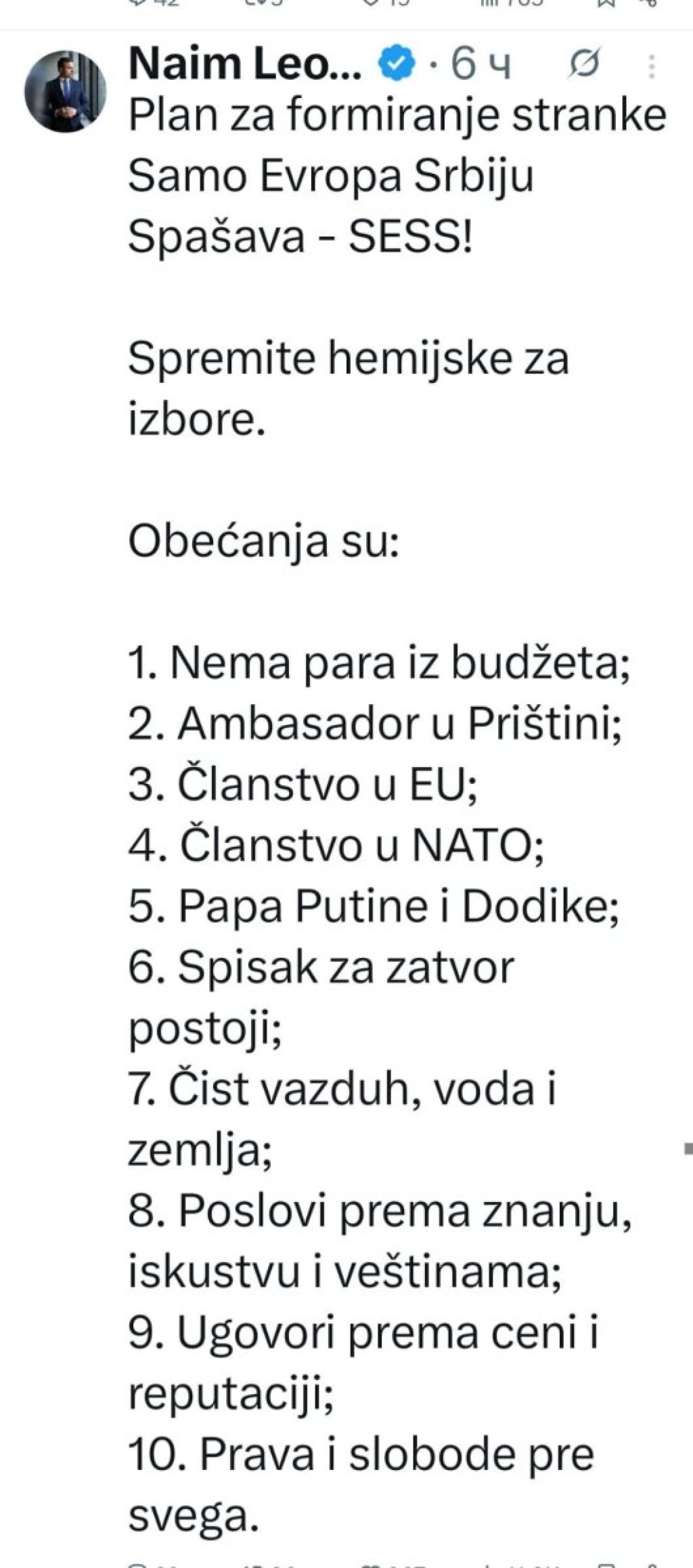 Naime, Beširi je na Iksu napisao: Plan za formiranje stranke Samo Evropa Srbiju spasava (SESS), spremite hemijske izbore, očigledno samouveren u to da ova navodna politička opcija njemu i njegovim blokaderima može da donese pobedu na narednom glasanju.