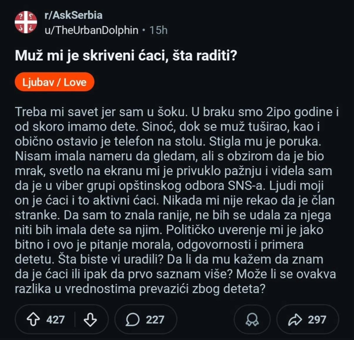 Blokadersko ludilo svakog dana poprima nove forme - a sada je na jednoj mreži supruga potražila savet da li da ostavi muža zato što je pristalica SNS politike.