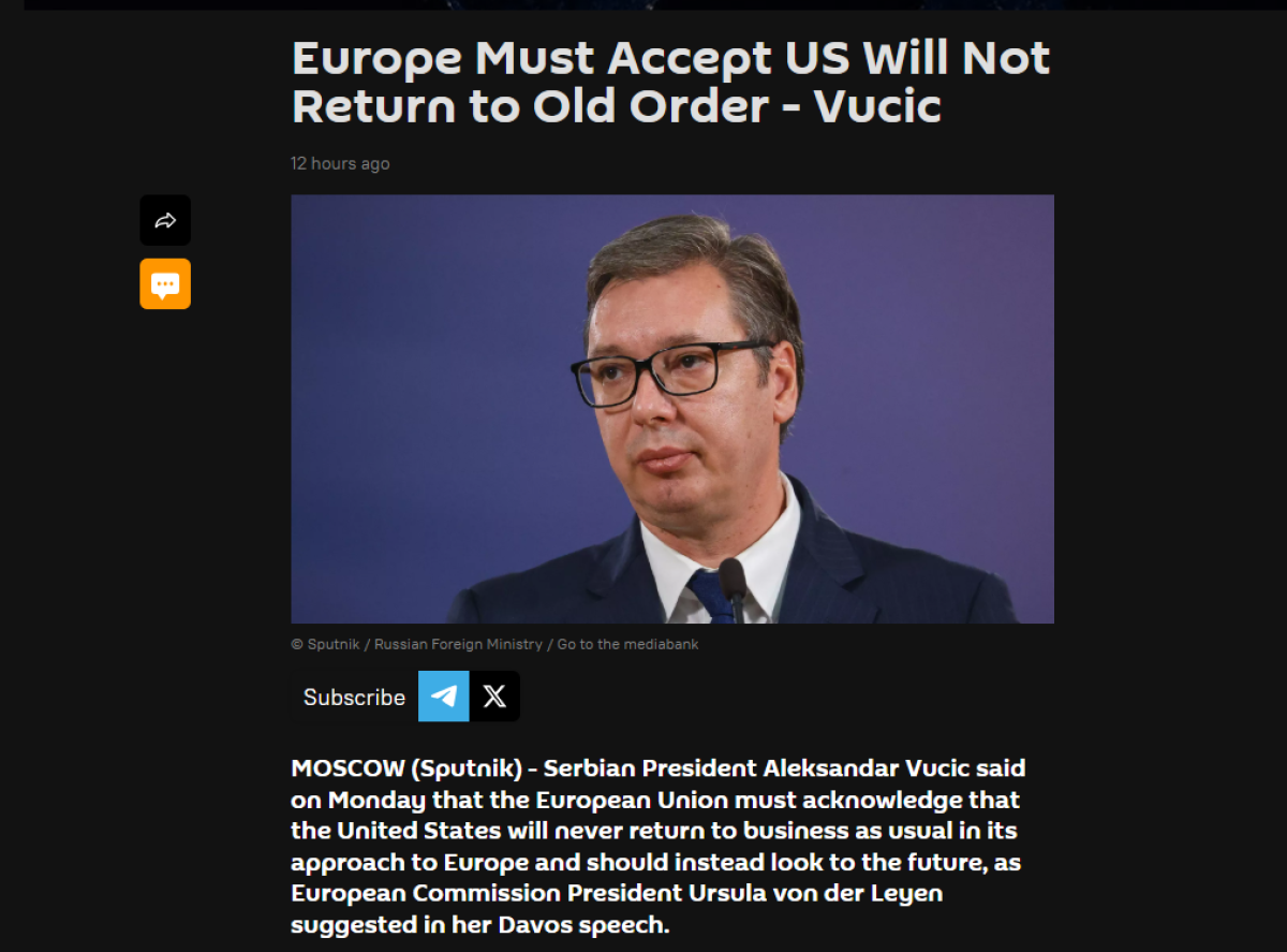 Sputnjik je u prvi plan stavio Vučićevo upozorenje evropskim liderima da je iluzija očekivati „povratak stare Amerike“ i da se međunarodni odnosi danas vode isključivo interesima, a ne nostalgijom. Portal je naglasio da se radi o poruci koja ima širi globalni značaj, u trenutku rastućih tenzija između Vašingtona i Brisela.