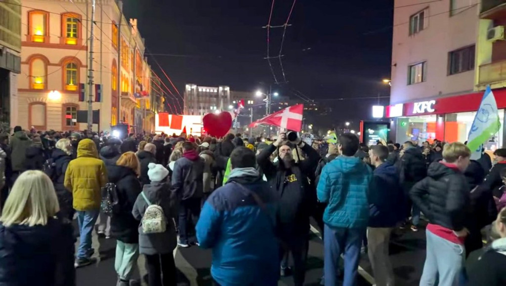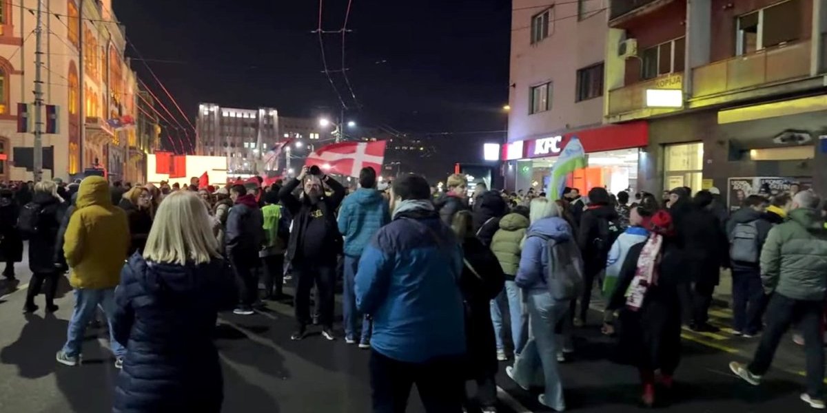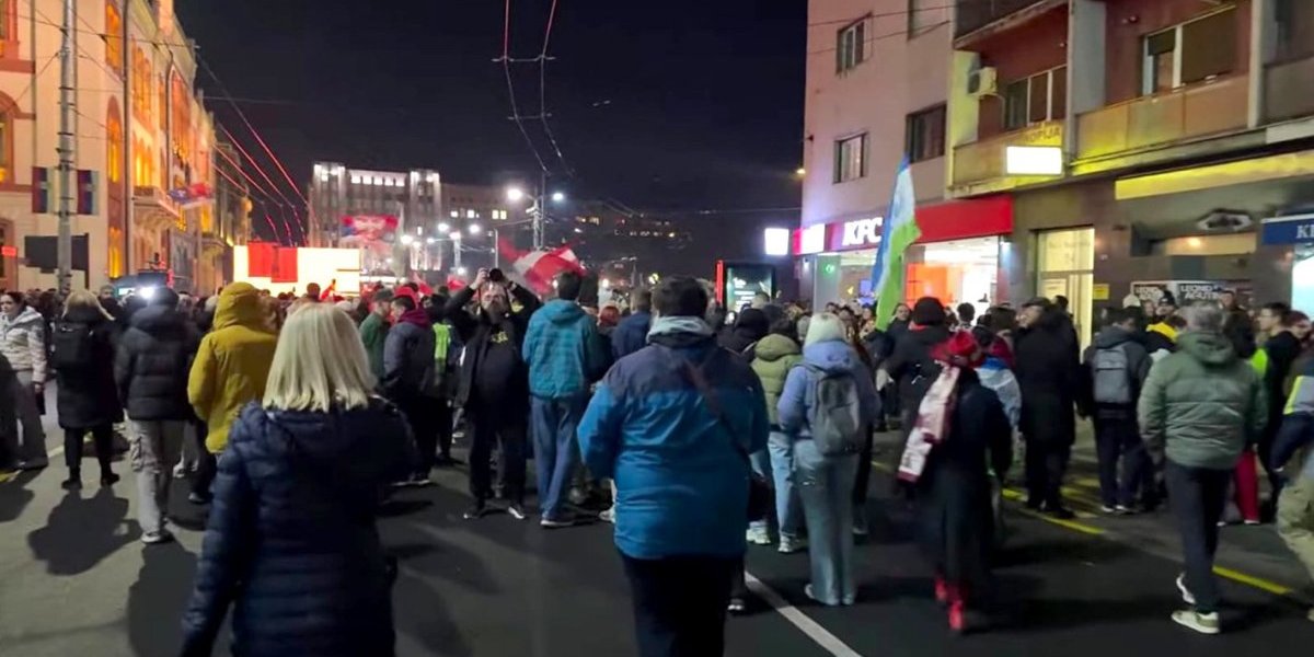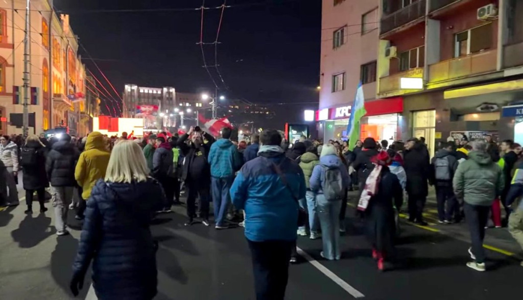 Kako se vidi na snimku, grupica blokadera prolazi pored kružnog toka na Slaviji, odakle idu ka zgradi Rektorata.