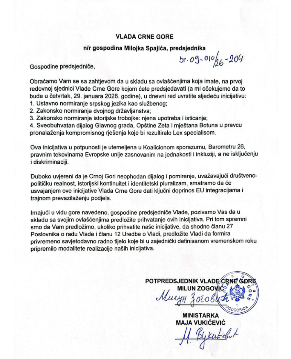 - Duboko uvereni da je Crnoj Gori potreban dijalog, a uvažavajući identitetski dualizam, očekujemo da Vlada da doprinos prevazilaženju podjela - pročitao je Zogović inicijativu dodajući da su predložili i radno telo koje bi pripremilo realizaciju inicijativa.
