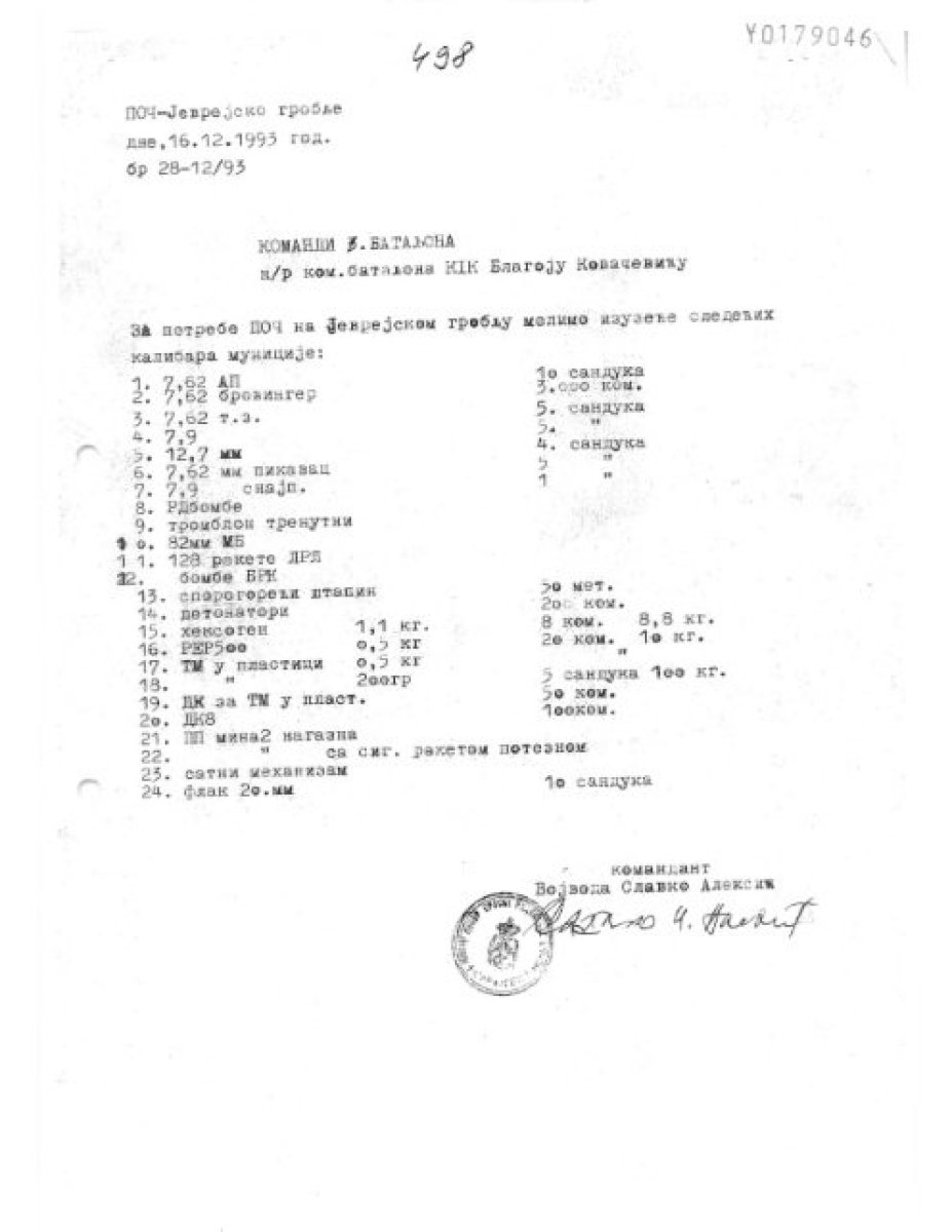 Slavko Aleksić je sve naredbe, odluke, zahteve upućivane prema komandi itd., kao komandant NČO pisao i potpisivao isključivo ćirilicom. Ispod je dokument koji je Aleksić uputio komandi Trećeg pešadijskog bataljona Prve sarajevske motorizovane brigade VRS-a (komandantu Blagoju Kovačeviću) 16. decembra 1993, u kojem traži da se za potrebe jedinice na Jevrejskom groblju obezbedi municija. Ovaj dokument je korišćen na suđenjima Radovanu Karadžiću i Ratku Mladiću u Hagu i na njemu je vidljiv žig Haškog tribunala.