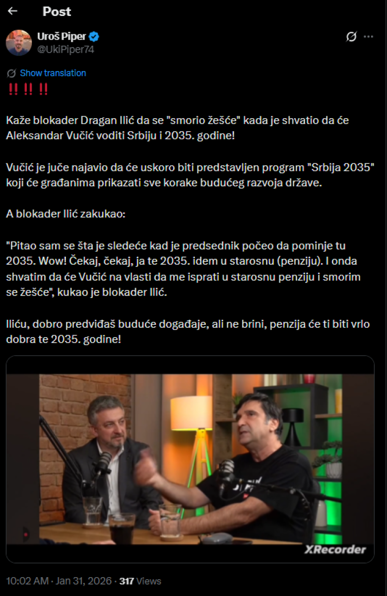 Vučić je juče najavio da će uskoro biti predstavljen program "Srbija 2035" koji će građanima prikazati sve korake budućeg razvoja države. A blokader Ilić zakukao: "Pitao sam se šta je sledeće kad je predsednik počeo da pominje tu 2035. Wow! Čekaj, čekaj, ja te 2035. idem u starosnu (penziju).
