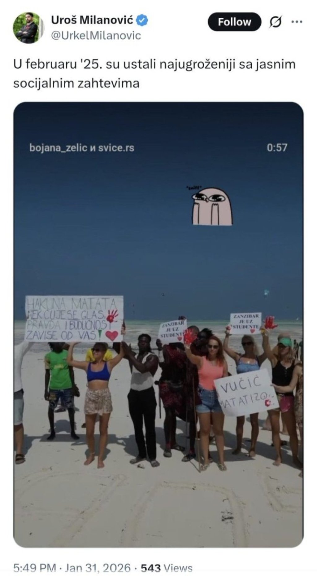- To su ovi naši roleks studenti, koji nemaju para, ali sa lakoćom otputuju na Zanzibar u najskuplje hotele. Uvek su ovi bogati najnezadovoljniji. Meni je drago da oni lepo mogu da sunčaju donji deo leđa i da uživaju, pošto smo Srbiju uništili i ovde je mnogo teško - poručio je predsednik.