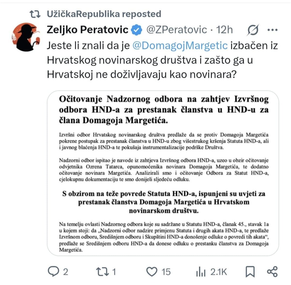 Naime, blokaderi su shvatili da Domagoj Margetić nije osoba čijim pričama treba verovati i to nakon što je jedan od blokadera na svom Iks nalogu objavio fotografiju - odluke da Margetić više ne bude član Hrvatskog novinarskog društva (HND)