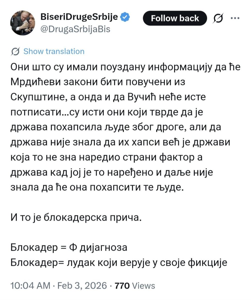 "Ovi što su imali pouzdanu informaciju da će Mrdićevi zakoni biti povučeni iz Skupštine, a onda i da Vučić neće iste potpisati... su isti oni koji tvrde da je država pohapsila ljude zbog droga, ali da država nije znala da ih hapsi već je državi koja to ne zna naredio strani faktor a država kad joj je to naređeno i dalje nije znala da će ona pohapsiti te ljude. I to je blokaderska priča", navedeno je.