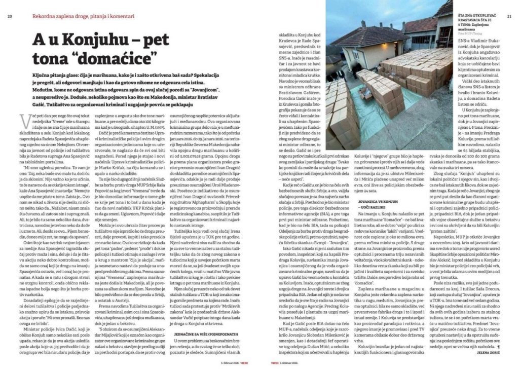 U tekstu koji je objavilo Vreme pod naslovom "A u Konjuhu - pet tona "domaćice"", Zorićeva je već u trećoj rečenici članka podvukla jednostavnu istinu - oni koji prave paralele između zaplene marihuane u selu kod Kruševca i Jovanjice - lažu.
