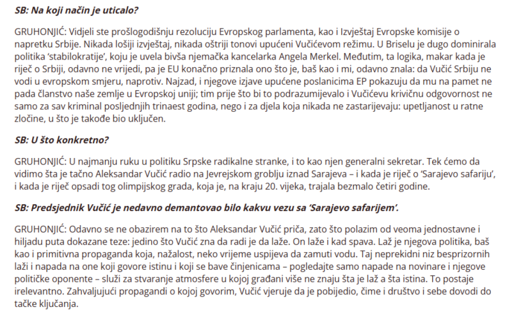 - Tek ćemo da vidimo šta je tačno Aleksandar Vučić radio na Jevrejskom groblju iznad Sarajeva - i kada je reč o 'Sarajevo safariju', i kada je reč opsadi tog olimpijskog grada, koja je, na kraju 20. veka, trajala bezmalo četiri godine - rekao je Grunjonjić za džihadističku Slobodnu Bosnu, a isti intervju prenela je i separatistička Autonomija.