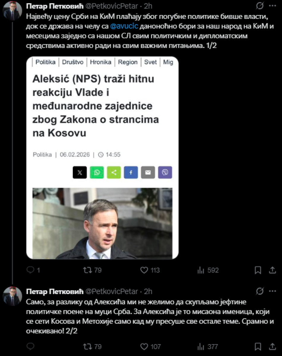 - Najveću cenu Srbi na KiM plaćaju zbog pogubne politike bivše vlasti, dok se država na čelu sa Aleksandrom Vučićem danonoćno bori za naš narod na KiM i mesecima zajedno sa našom Srpskom listom svim političkim i diplomatskim sredstvima aktivno radi na svim važnim pitanjima - naveo je Petar Petković na mreži X reagujući na saopštenje predsednika Narodnog pokreta Srbije Miroslava Aleksića u kojem je zatražio hitnu reakciju Vlade zbog prištinskog tzv. zakona o strancima.