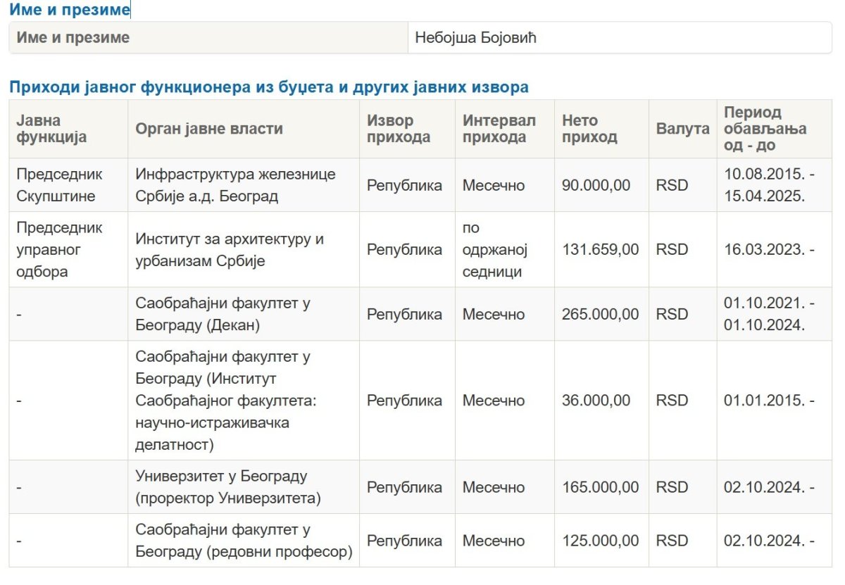 Ni to nije dovoljno. Nebojša Bojović od Saobraćajnog fakulteta ima novac po dva osnova. Plata redovnog profesora iznosi mu 125.000 dinara, a uzima još 36.000 dinara za nešto što je prijavio kao Institut Saobraćajnog fakulteta i naučno-istraživačka delatnost.