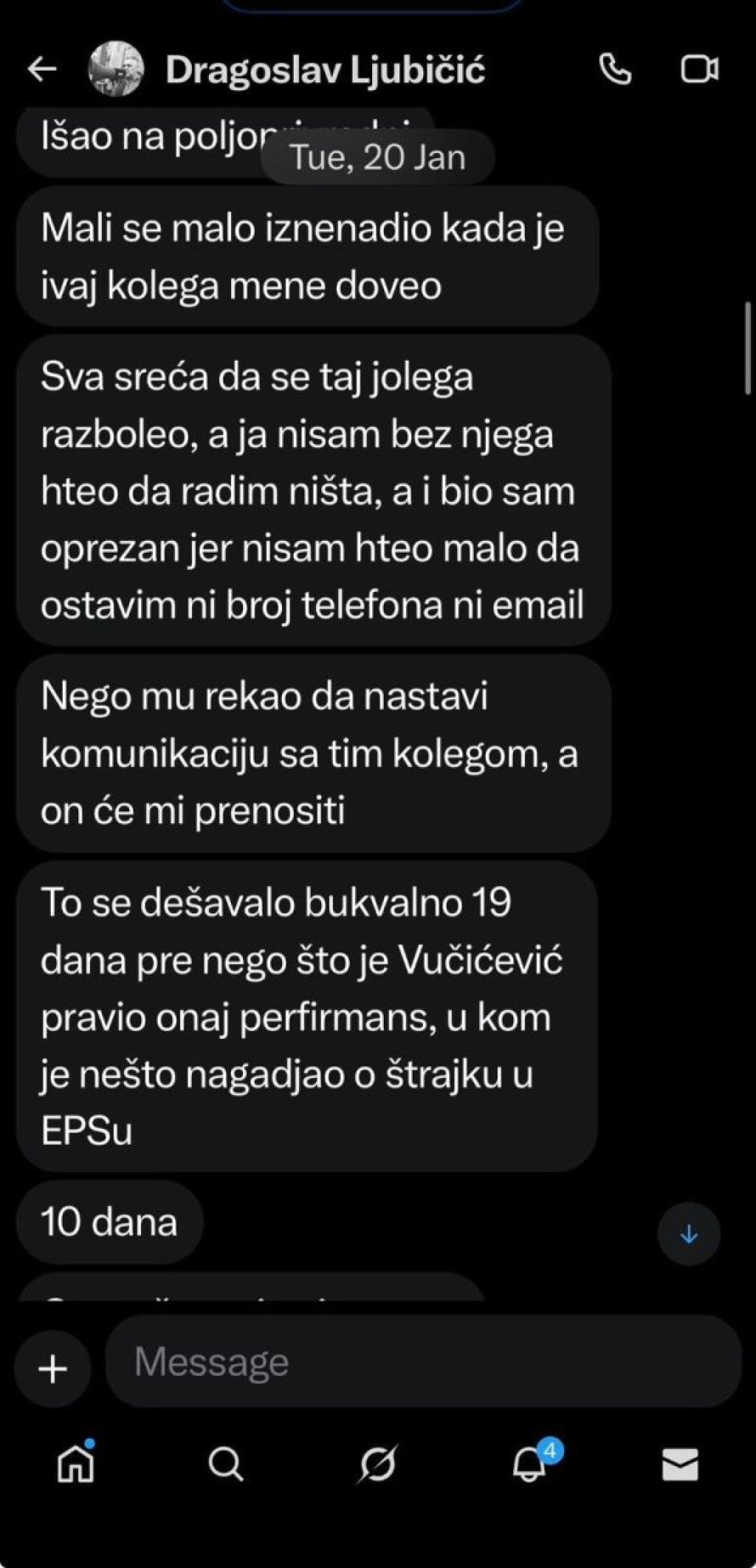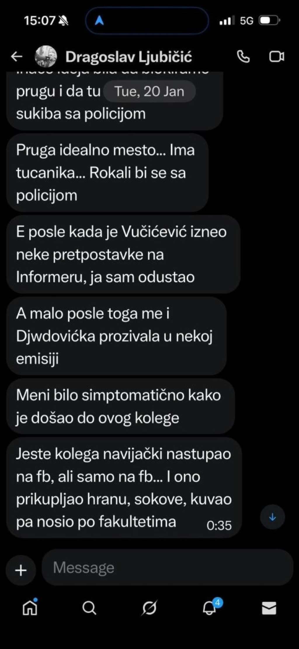 Kao dokaz ovih tvrdnji prosleđeni su i skrinšotovi navodne prepiske između Mišića i Ljubičića. U razgovorima se pominje ideja o blokadi pruge i mogućem sukobu sa policijom, kao i procene da bi takva akcija mogla dovesti do širih posledica u javnosti. U jednom delu prepiske navodi se da je ideja bila „da blokiramo prugu i da tu ostanemo do sukoba sa policijom”, dok se u drugom delu pominje odustajanje od plana nakon medijskih najava i javnih pretpostavki o mogućem štrajku u EPS-u.