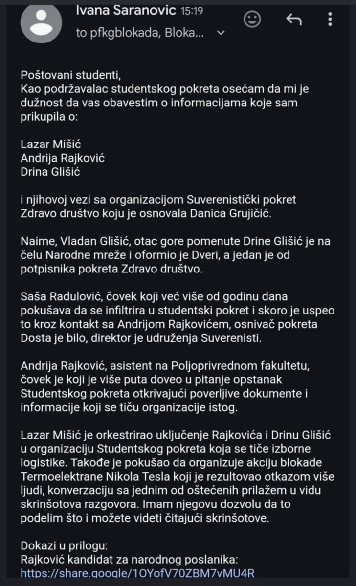 U dopisu koji potpisuje Ivana Šaranović, a koji je, kako se navodi, poslat studentskim grupama i blokadama, iznose se tvrdnje o navodnim vezama pojedinih aktera studentskog pokreta sa političkim organizacijama i pojedincima sa javne scene. U centru optužbi našli su se Lazar Mišić, Andrija Rajković i Drina Glišić.