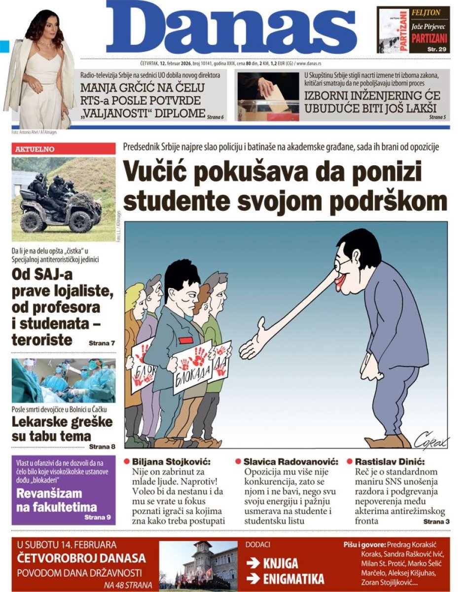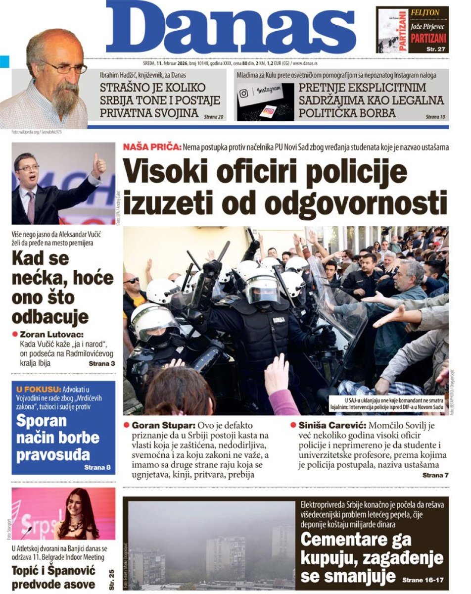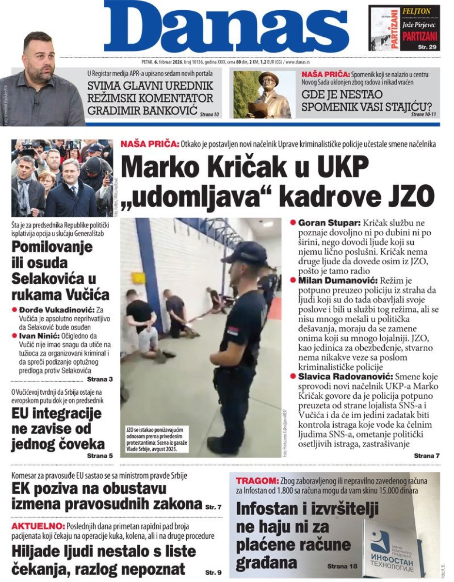 Dana 6. februara Danas je kao glavnu najavu na naslovnoj strani štampanog izdanja objavio članak pod naslovom "Marko Kričak u UKP udomljava kadrove JZO", četiri dana kasnije objavljen je članak pod naslovom "Visoki oficiri policije izuzeti od odgovornosti", da bi u današnjem štampanom izdanju objavljen tekst "Od SAJ prave lojaliste, od profesora i studenata - teroriste".