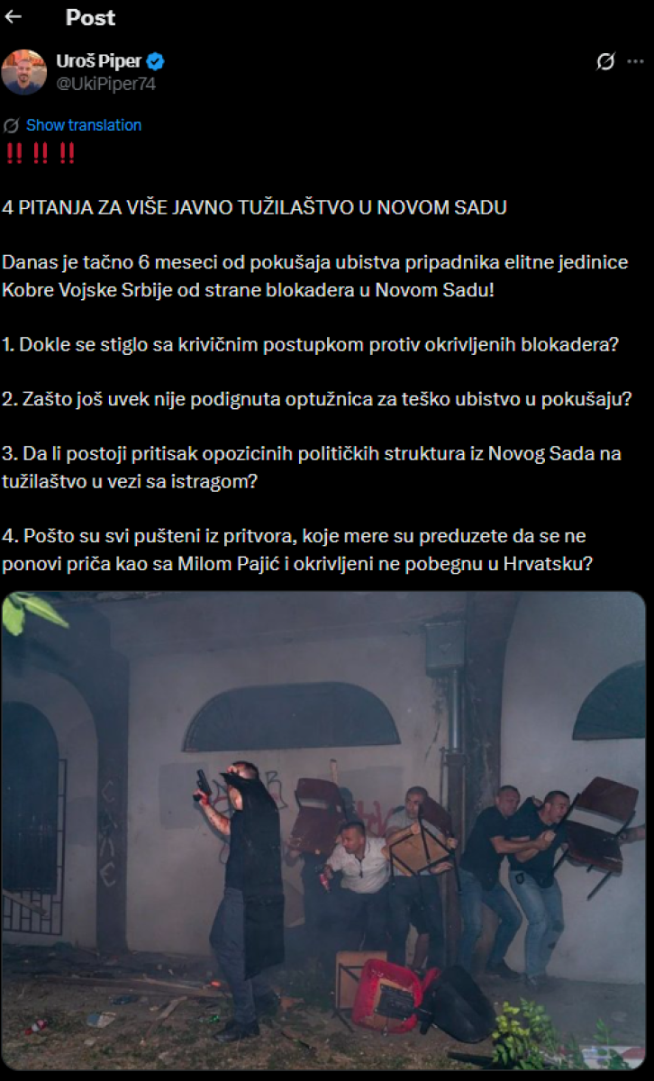 4. Pošto su svi pušteni iz pritvora, koje mere su preduzete da se ne ponovi priča kao sa Milom Pajić i okrivljeni ne pobegnu u Hrvatsku? - napisao je Uroš Piper.
