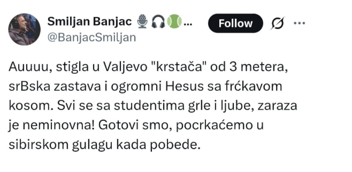 - Auuuu, stigla u Valjevo "krstača" od 3 metera, srBska zastava i ogromni Hesus sa frćkavom kosom. Svi se sa studentima grle i ljube, zaraza je neminovna! Gotovi smo, pocrkaćemo u sibirskom gulagu kada pobede - napisao je Banjac na Iksu.