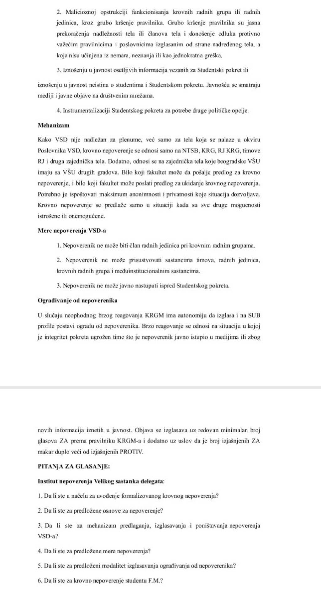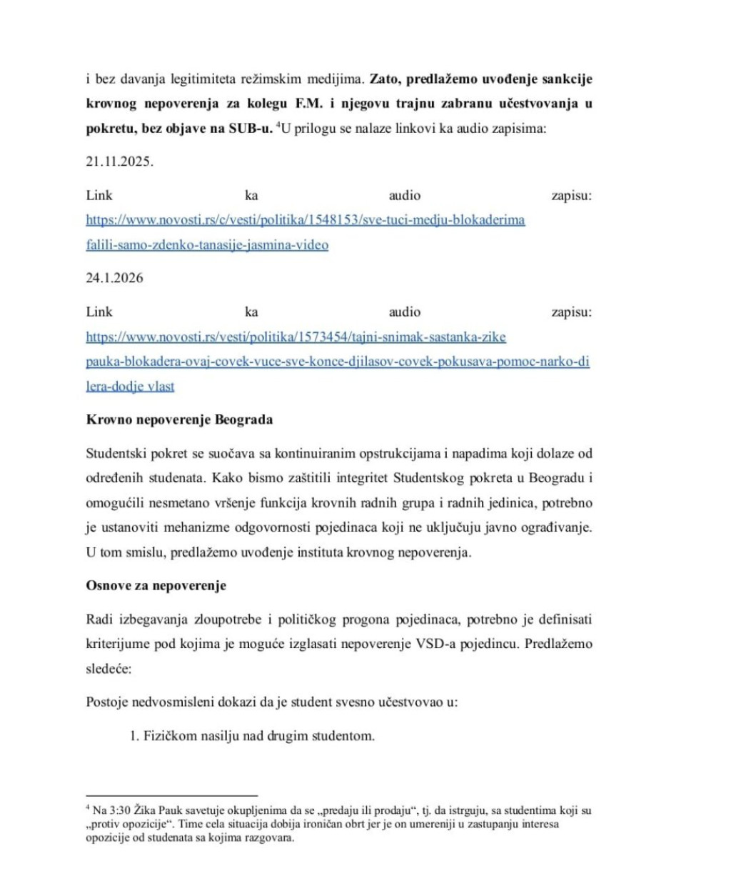 Interesantno, samo par dana kasnije, nakon što je F.M. sa Žikom Paukom raspravljao o studentima koji su nepogodni po njihove interese, dolazi na sastanak RJIL tima za narativ sa namerom da smeni trenutnu koordinatorku, napadajući je, vređajući je, omalovažavajući njen rad. Stvorivši toliko neprijatnu i nekolegijalnu atmosferu, sastanak je raspušten... Smatramo da kolega F.M. mora da bude udaljen iz Pokreta... Zato predlažemo uvođenje sankcije krovnog nepoverenja za kolegu F.M. i njegovu trajnu zabranu učestvovanja u Pokretu, bez objave na SUB-u.