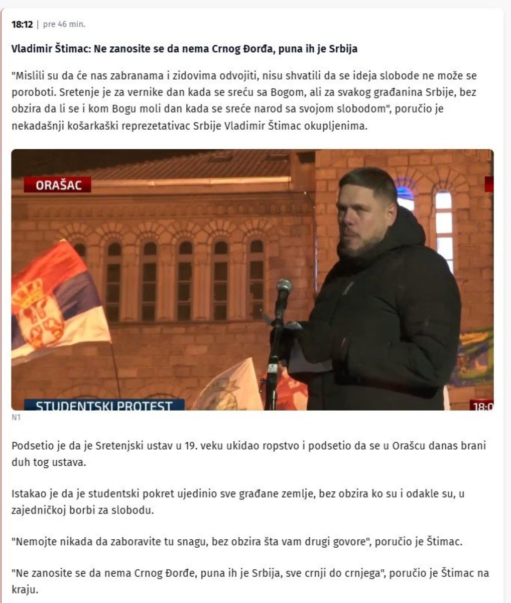 Podsetimo, Štimac je osumnjičen da je 2. novembra pred okupljenim građanima, koji su ga snimali i to kasnije objavljivali na društvenim mrežama, pozivao građane da dođu pred Dom Narodne skupštine, sve vreme psovao pripadnike policije i učesnike drugog skupa, pokušavajući da napravi emotivni naboj kod građana, uz tvrdnje da policija napada Dijanu Hrku, majku mladića koji je poginuo 1. novembra 2024. godine prilikom pada nadstrešnice na Železničkoj stanici u Novom Sadu, a koja štrajkuje glađu.