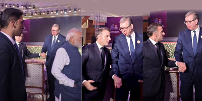 "Na drugom kraju sveta, u Nju Delhiju, sa prijateljem Makronom uvek srdačno i u dobrom raspoloženju, pogotovo posle izuzetne večere koju su nam priredili ljubazni domaćini. Iako nije bilo vremena za ozbiljne i teške teme, iskoristili smo nekoliko trenutaka da razmenimo mišljenja o indijskom Samitu o veštačkoj inteligenciji i mestu i ulozi Srbije i Francuske u novom svetu čijem nastanku svedočimo", napisao je Vučić na svom Instagram profilu 'buducnostsrbijeav'.
