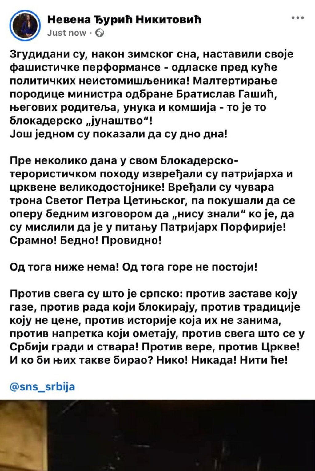 Blokaderi ponovo prave haos, ovog puta napali i porodicu ministra Gašića.Povodom ovih događaja, oglasili su se poslanici SNS-a Nevena Đurić i Zoran Tomić i oštro osudili ovakve napade