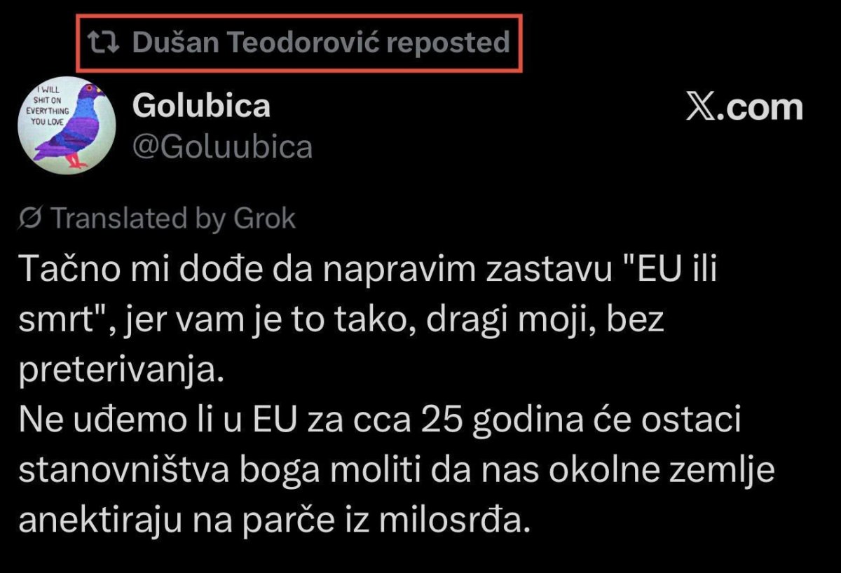 Dušan Teodorović je "retvitovao" objavu na društvenoj mreži Iks u kojoj se pominje rasparčavanje Srbije kao nagrada.