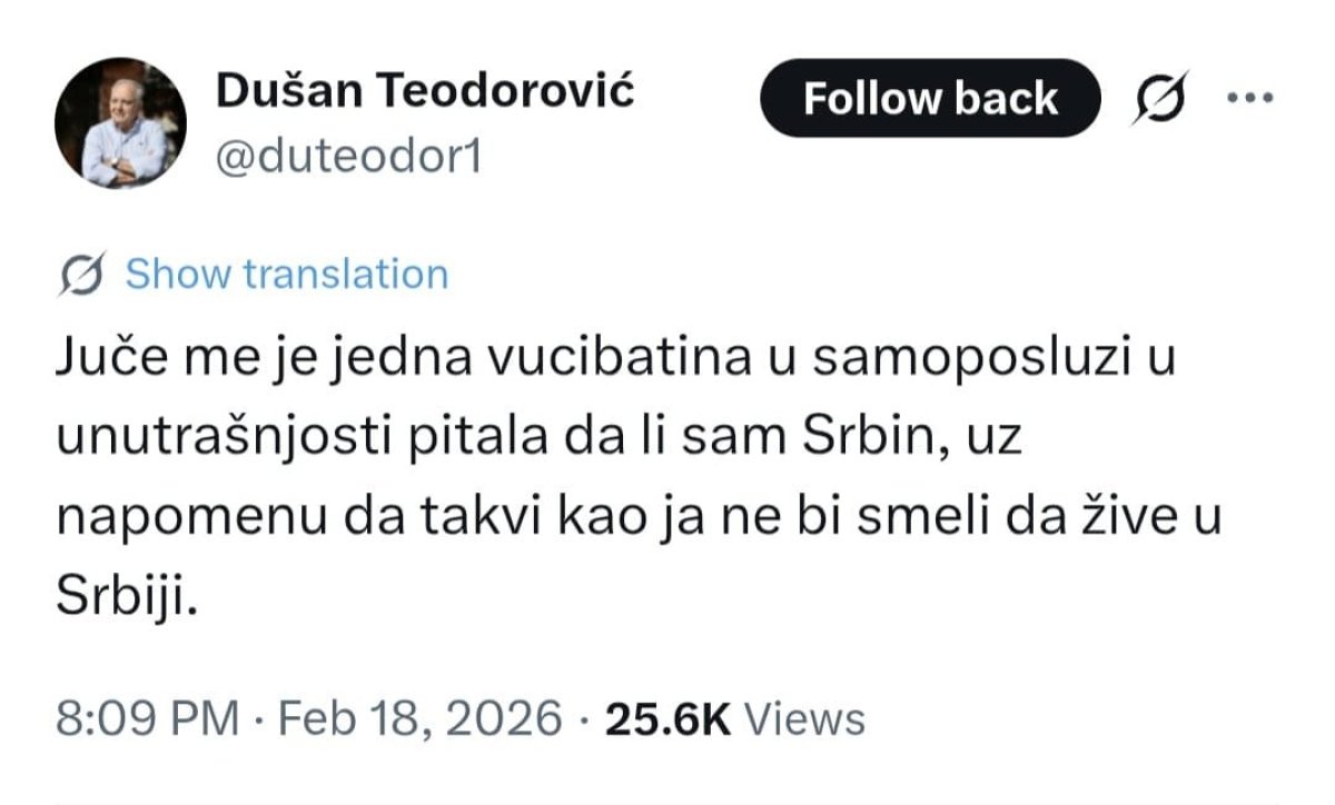 - Juče me je jedna vucibatina u samoposluzi u unutrašnjosti pitala da li sam Srbin, uz napomenu da takvi kao ja ne bi smeli da žive u Srbiji.