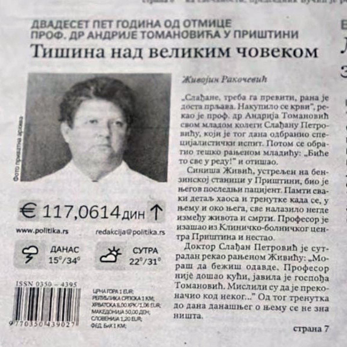 Dr Andrija Tomanović iz Prištine, koji je spasao živote mnogih Srba, ali i Albanaca, kidnapovan je 24. juna 1999, a njegova sudbina ni danas nije poznata.