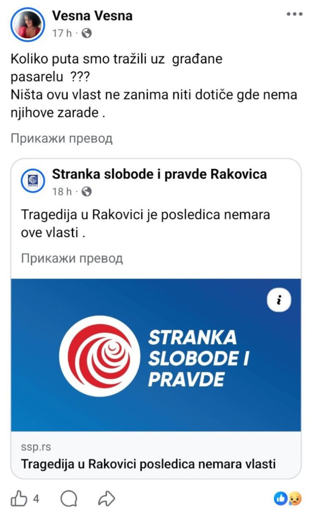 - Koliko smo puta uz građane tražili pasarelu? Ništa ovu vlast ne zanima, niti dotiče, gde nema njihove zarade - napisala je Džidić podelivši objavu fejsbuk stranice SSP Rakovica.