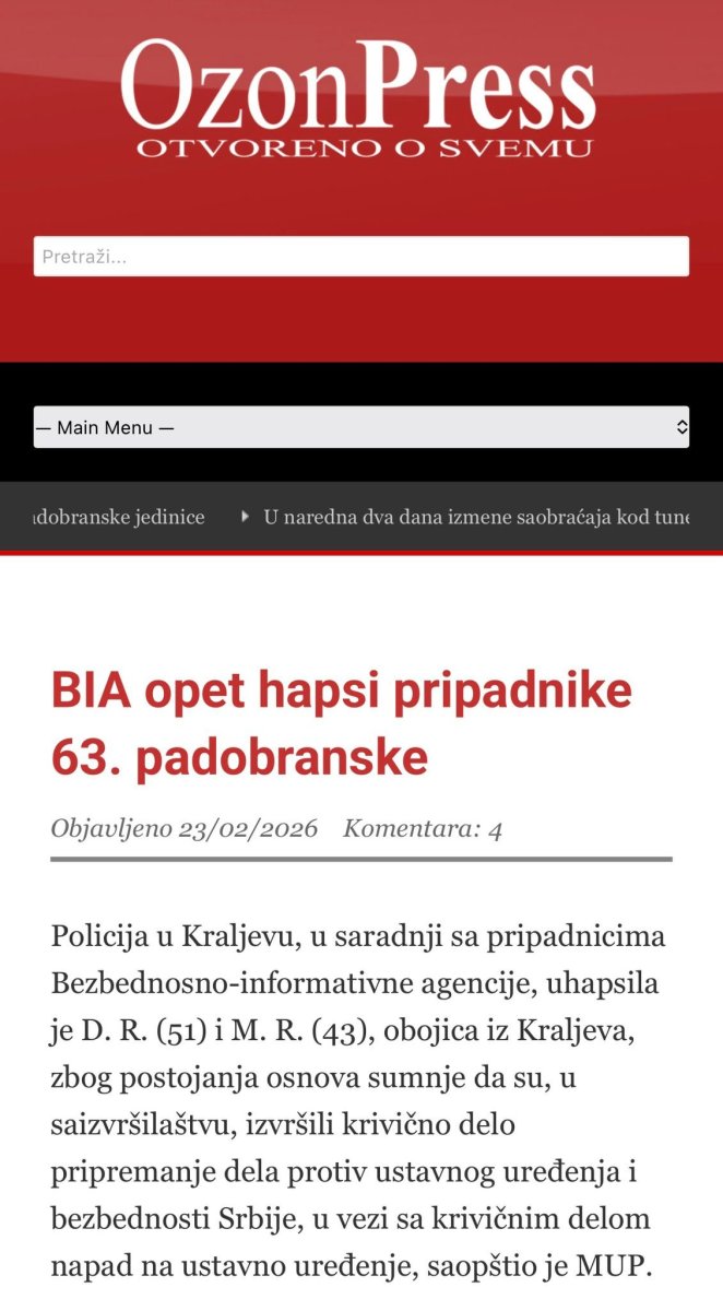 Podsetimo, pripadnici Ministarstva unutrašnjih poslova, Uprave kriminalističke policije - Službe za suzbijanje kriminala i policijski službenici PU Kraljevo, u saradnji sa pripadnicima Bezbednosno-informativne agencije, uhapsili su D. R. (51) i M. R. (43), iz Kraljeva, zbog postojanja osnova sumnje da su, u saizvršilaštvu, izvršili krivično delo pripremanje dela protiv ustavnog uređenja i bezbednosti Srbije, u vezi sa krivičnim delom napad na ustavno uređenje.