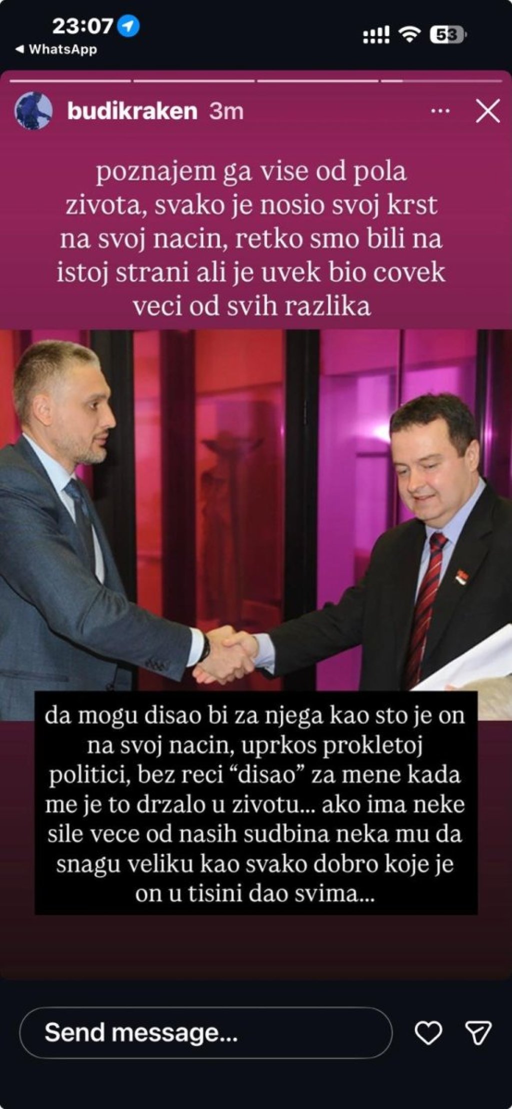 - Poznajem ga više od pola života, svako je nosio svoj krst na svoj način. Retko smo bili na istoj strani, ali uvek je bio čovek veći od svih razlika.Da mogu disao bih za njega, kao što je on na svom način, uprkos prokletoj politici, bez reči, disao za mene, kada me je to držalo u životu... Ako ima neke sile veće od naših sudbina, nek mu da snagu veliku kao svako dobro koje je on u tišini dao svima - napisao je Jovanović na Instagramu.