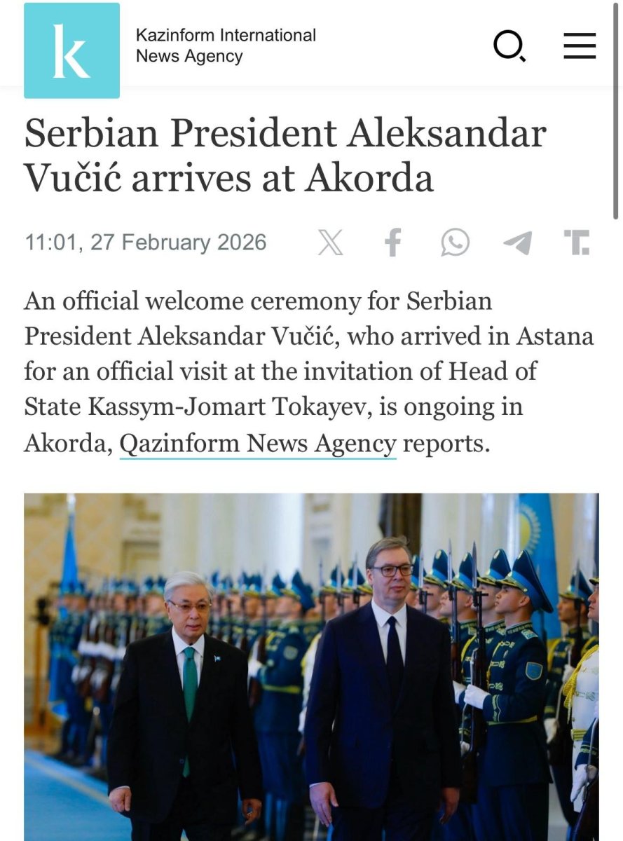 Podsetimo, predsednik Srbije Aleksandar Vučić boravi u Astani u Kazahstanu, gde ga je danas dočekao tamošnji predsednik Kasim Žomart Tokajev uz najviše počasti.