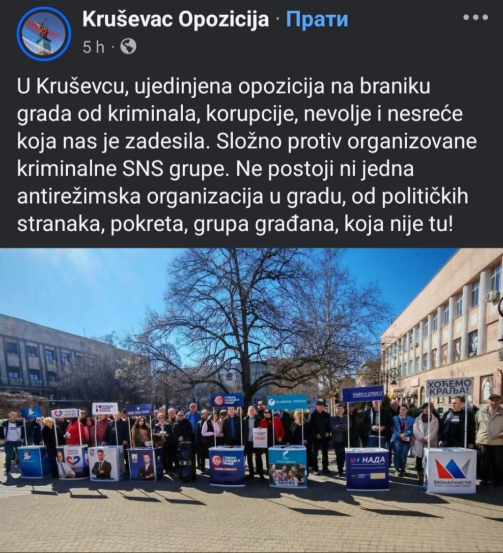 Šef odborničke grupe u skupštini grada Kruševca, Zoran Tomić reagovao je na društvenoj mreži Iks povodom fotografije nastale u Kruševcu, na kojoj se kako navodi, aludira na tvrdnju da su "blokaderi složni oko organizovane kriminalne grupe SNS".