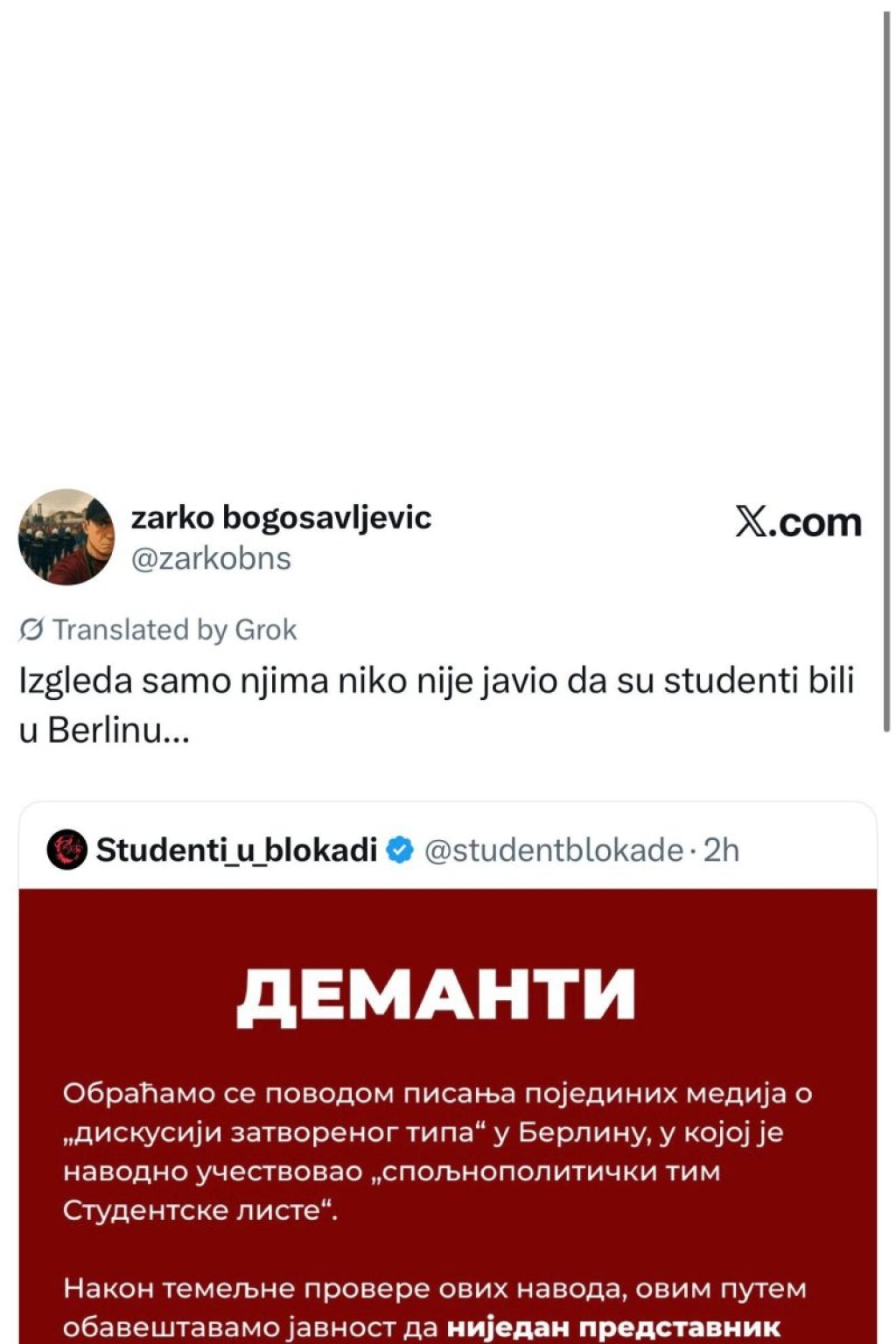 Studentski pokret "Studenti u blokadi" oglasio se zvaničnim demantom povodom pisanja Nova S o navodnoj "diskusiji zatvorenog tipa" u Berlinu, u kojoj je, prema tim tvrdnjama, učestvovao "spoljnopolitički tim Studentske liste".