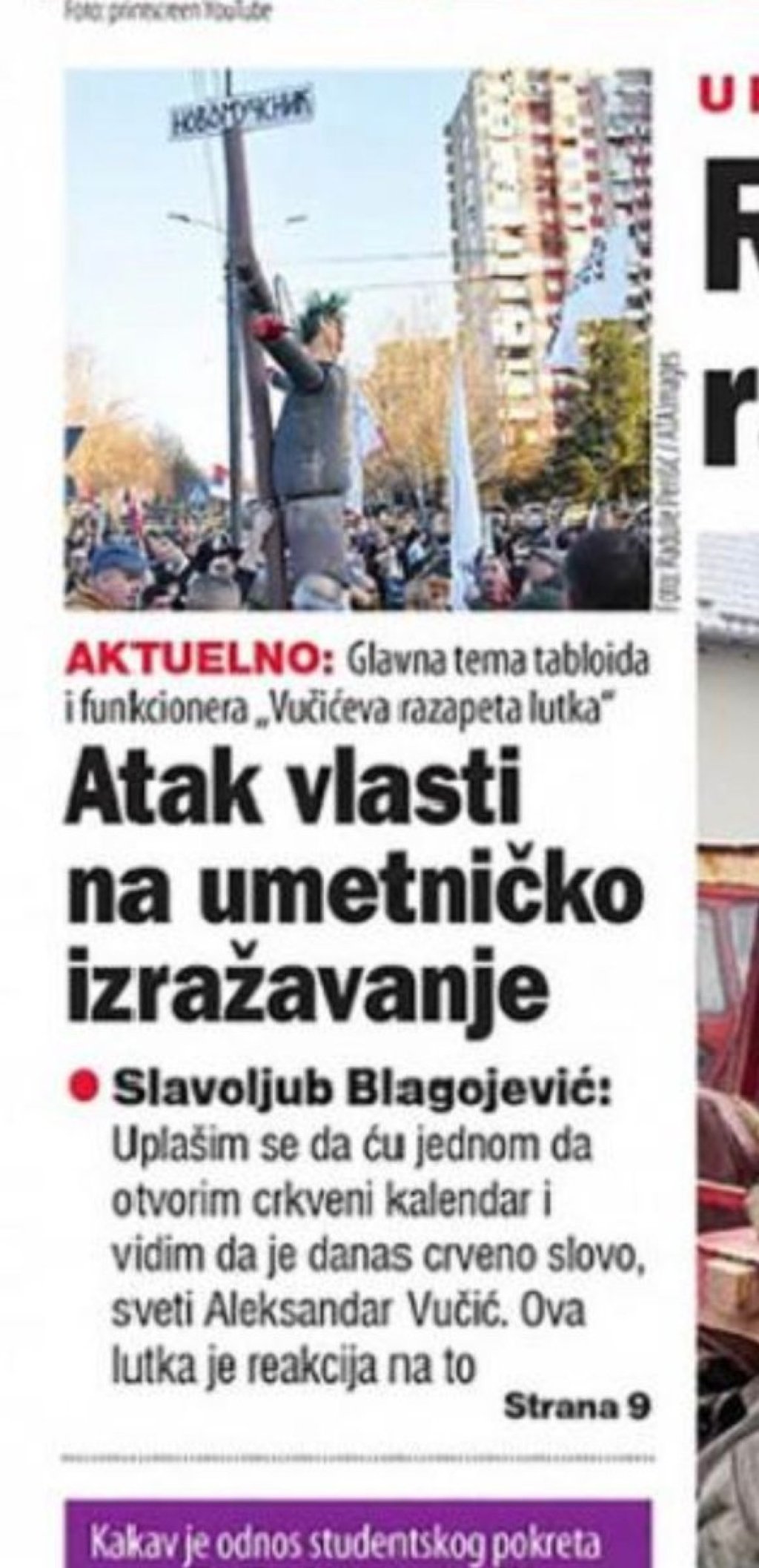 - Atak vlasti na umetničko izražavanje - glasi sraman naslov teksta današnjeg tajkunskog niskotiražnog lista u kom se, verovali ili ne, sarkastičnim tonom u neku ruku izražava čuđenje što je "Vučićeva razapeta lutka" glavna tema tabloida i funkcionera.