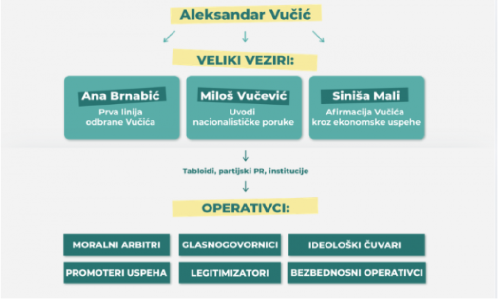 Kako su naveli dežurni hejteri i CRTE i Istinomera, predsednica Skupštine Srbije Ana Brnabić, ministar finansija Siniša Mali i lider Srpske napredne stranke i savetnik predsednika Srbije Miloš Vučević svrstani su u grupu "Vučićevih vezira".